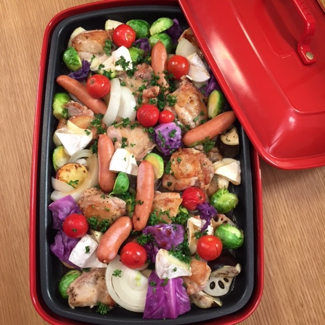 3) プレートにバターとニンニクをひき、1の肉の皮目を下にして並べる。間に野菜を並べ、高温に設定して蓋をして5分ほど加熱する。肉を裏返して中温にし、シャウエッセンとチーズ、プチトマトをのせて、再び蓋をして5分ほど蒸し焼きにする。