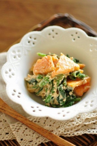 ほうれん草と柿の洋風白和え 材料(4人分)・ほうれん草 1束・柿 1個A・クリームチーズ 50g・だし汁 大さじ2・味噌 大さじ1・すりごま 大さじ1 作り方1)ほうれん草は熱湯に塩少々(分量外)を入れた湯でゆでて、冷水に取る。水気を絞って3センチの長さに切る。2)柿は皮をむいて薄切りにする。3)クリームチーズは電子レンジで20秒ほど温めて柔らかくし、だし汁、味噌、すりごまを合わせる。これに1)のほうれん草と2)の柿を加えてざっくりと和える。 < 前の記事次の記事 > コメント コメントフォーム 名前 コメント 記事の評価 リセット リセット 顔 星 情報を記憶 コメントを投稿する