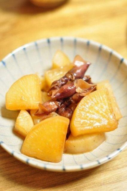 2) 厚手のお鍋にごま油と大根を入れて、ふたをして弱火で蒸し焼きにする。時折かき混ぜながら10分ほど蒸したら、水を加えてふたをし、10分ほど煮る。火が通ったのを確認して、ボイルホタルイカと酒を加え、ふたをして5分ほど煮る。