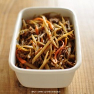 2)フライパンにごま油をひいて熱し、牛肉を入れて炒める。色が変わってきたらごぼうと人参を入れて全体がしんなりするまで炒める(10分くらい)。