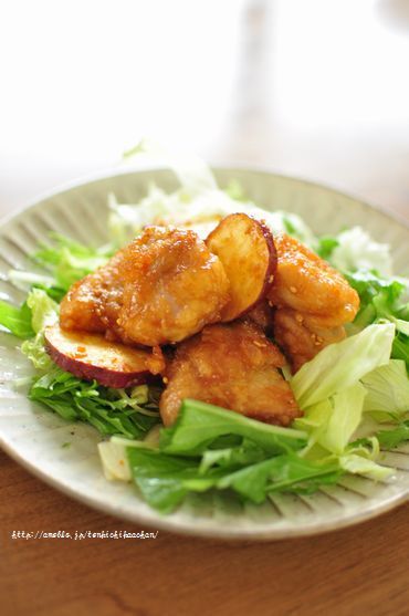 3)フライパンに1センチくらいの深さになるようサラダ油を注ぎ、170度の油で1の鶏肉を揚げ焼きにする。鶏肉を取り出し、さつまいもも両面こんがりと焼いて取り出す。