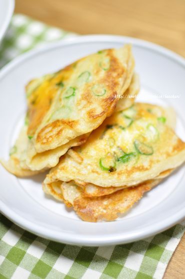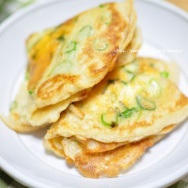 2)フライパンにサラダ油をひいて中火にかけ、1をお玉に1杯分くらい流しいれてクレープ状に広げ、スライスチーズと青ネギを乗せる。