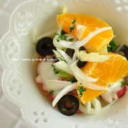 2)ボウルに新玉ねぎとセロリ、蛸、パセリを入れてAを入れてざっくりと和える。全体に調味料が行き渡ってからオレンジとブラックオリーブを加えて軽く和え、ラップをして30分以上冷蔵庫で冷やしてなじませる。
