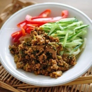 3)うどんはルクエに入れて2,3分レンジ加熱し、お皿に入れる。きゅうりとパプリカを乗せ、2の肉みそを乗せる。