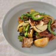 1)ゴーヤは半分に切ってワタをかきだし、薄くスライスする。ボウルに入れて塩をふり、暫くおいてしんなりしてきたら水にさらしてギュッと絞る。ジャガイモは皮ごとよく洗ってくし型に切り、レンジ対応容器に入れて700wで3分~3分半ほど加熱する。豚肉は4センチ長さに切る。