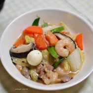 2)フライパンにサラダ油(分量外)をひき、豚肉とむきエビを炒める。色が変わったら人参と白菜をくわえて炒め、しいたけ、カニカマも入れて水をくわえて煮立たせる。あくをすくい、きぬさやとウズラをくわえる。
