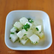 大根のシンプルコンソメパセリ 材料(4人分) ・大根 350g ・コンソメ(顆粒) 小1 ・パセリ 少々 ・オリーブオイル 大1 作り方 1)大根は皮ごと1・5センチ角くらいに切り、レンジ対応容器に入れてコンソメを振りかけ、レンジで4分ほど加熱する(700wです)。 2)パセリとオリーブオイルを加えて和える。 ※コンソメの塩分がありますので、そのほかに味付けはしません。 お好みでブラックペパーを振ってもいい感じです。 < 前の記事次の記事 > コメント コメント一覧 (4) 4. かな姐 2011年02月25日 11:58 >おけいさん あと一品のお役に立ててよかったです。 梅田の料理教室、応募してくださってありがとう。 月曜にまた打ち合わせがあるので、どのくらいの応募があったか楽しみです^^ 結婚式前ですか♪ お忙しいですね・・・♪ おめでとうございます! 3. おけい 2011年02月21日 19:00 あと一品大根で探してました!! 今晩採用させていただきます☆ 梅田のお料理教室、結婚式前ですが姉妹で応募させてもらいます♪ 当選するといいな(*^^*) 2. かな姐 2010年12月31日 12:49 >ミスバニーさん 洋風の箸休めみたいな存在ですかね^^ 豚の角煮、美味しそう~ おなか空いてきちゃった・・・ 1. ミスバニー 2010年12月12日 16:13 これは漬け物かなと最初思いましたので レシピ知りたかったです(≡^∇^≡) 食べたらどんな味なのだろう。 今日も、超久しぶりに豚の角煮を 食べました≧(´▽`)≦ めったに食べないので、美味しかったです。 コメントフォーム 名前 コメント 記事の評価 リセット リセット 顔 星 情報を記憶 コメントを投稿する トラックバック