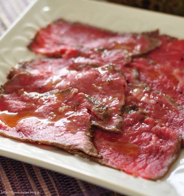 3. すべての面に焼き色がついたらすぐに皿に移し、冷ます。粗熱が取れたらラップして冷蔵庫で30分ほど休ませる。肉が冷えたら薄くスライスして皿に盛り付け、岩塩とレモンオリーブ油リモーネを掛ける。