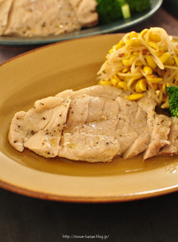 3)手で触れるくらいまで冷めたら、ラップを外して斜めにそぎ切りにして盛り付け、蒸し汁を適量かける、