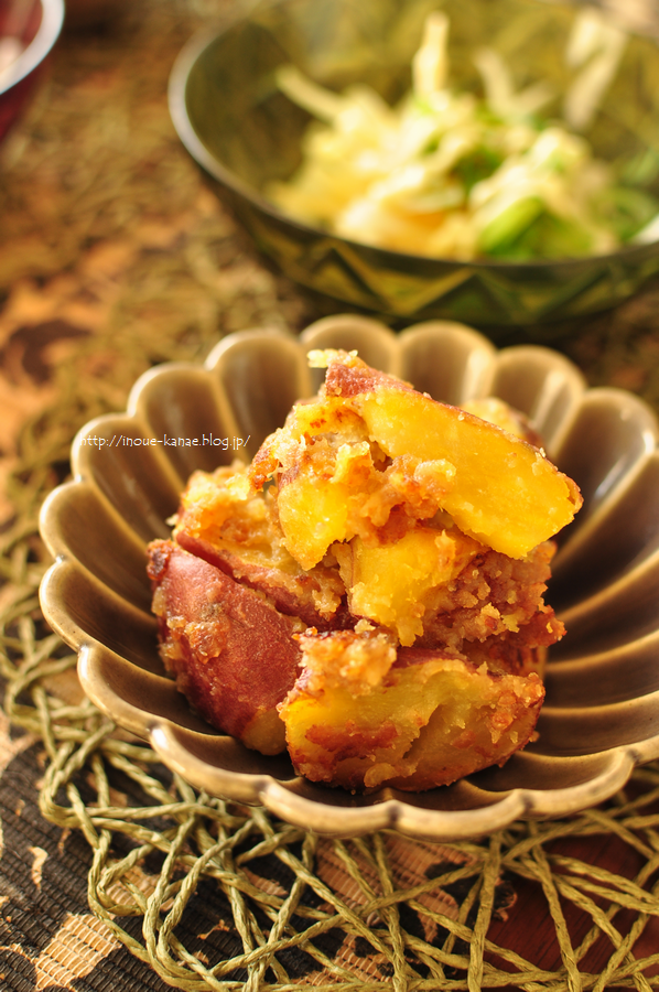 1)サツマイモは皮ごとごしごし洗って小さめの乱切りに、水にさらす。