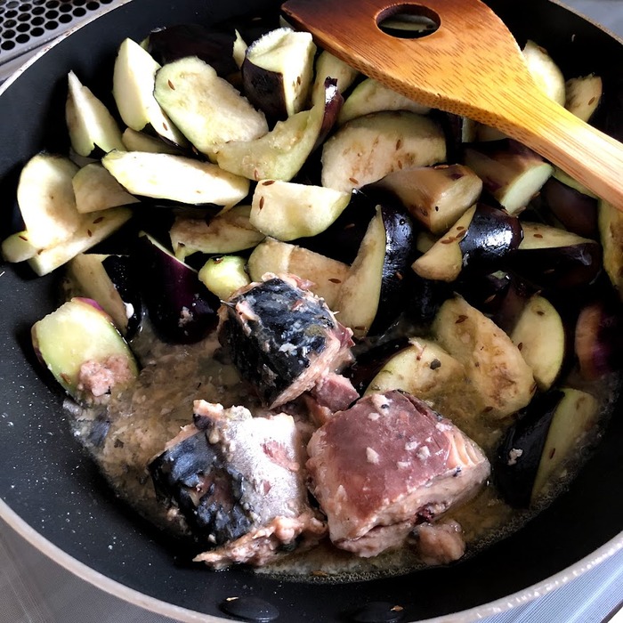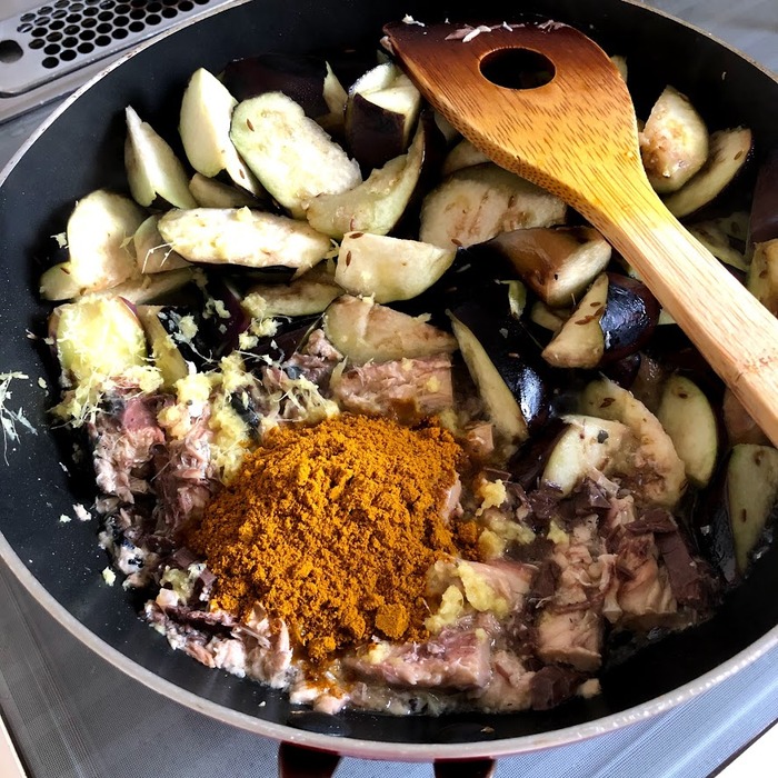 2)フライパンに油とクミンを入れて中火にかけ、香りが立ってきたらナスを加えて炒める。全体に油が回ったら鯖缶を汁ごと加え、カレー粉、レッドペパー、ニンニク、ショウガを入れてさらに炒める。