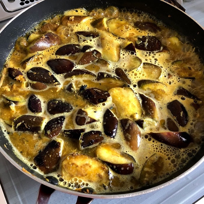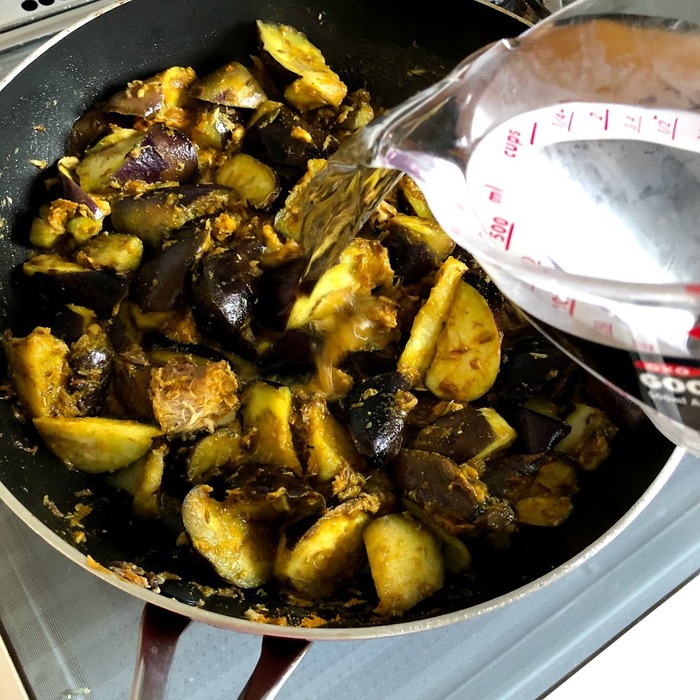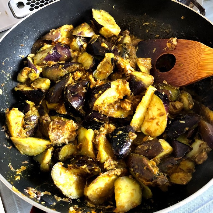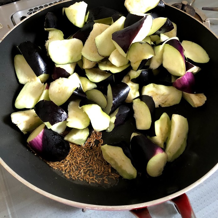 クミンから細かい泡が出てきてしゅわ~~~~って音がしてきて、いい香りがして来たらナス(塩水につけて絞っとくと短時間で火が通る)を入れて