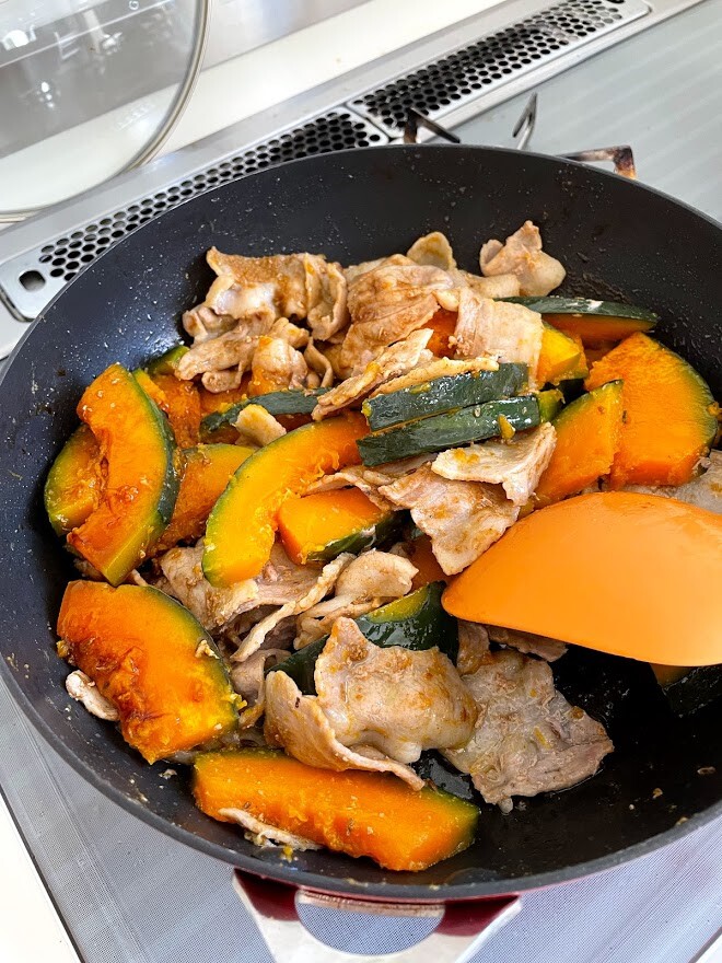 かぼちゃをひっくり返し、豚肉の表面に固まっているガラムマサラをなじませるように全体を混ぜます。