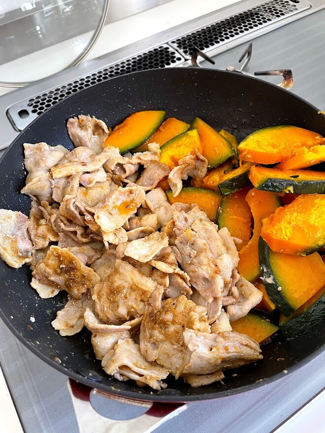 3)ふたを閉め、中火で10分蒸し焼きにする。10分後、蓋を取ってかぼちゃを裏返し、豚肉もよく混ぜて味をなじませつつ、フライパンに残っている水分を飛ばすように加熱し続ける。