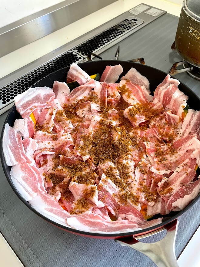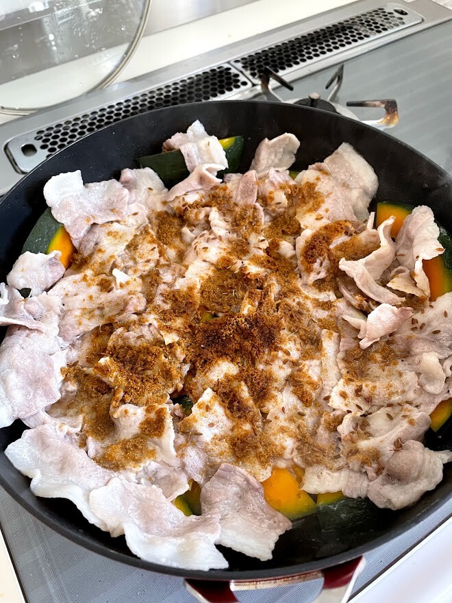 2)フライパンにサラダ油をひいてなじませ、かぼちゃを全体に広げておく。その上に豚肉も1枚ずつ広げてなるべく重ならないように並べ、塩、クミン、ガラムマサラを振りかける。(※塩、重要です。主要な味付けの一つになっています)