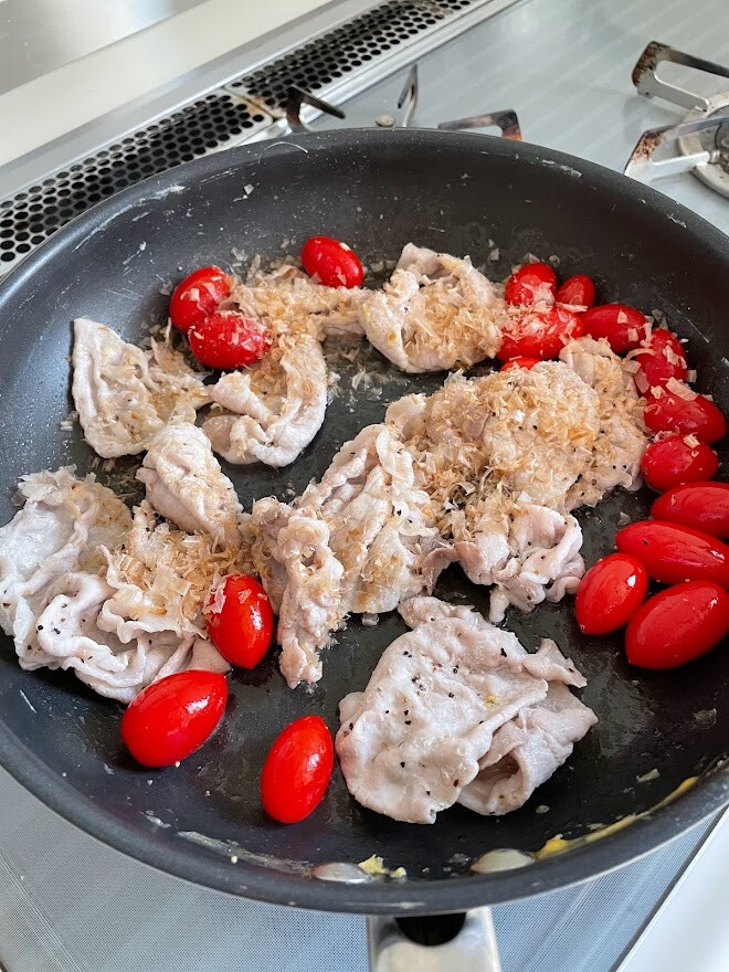 3)空いたフライパンに油をたし、豚肉を1枚ずつ広げて入れる。中火で色が変わるまで炒めたら、塩、ブラックペパーを振ってミニトマトを入れ、削り節も入れる。