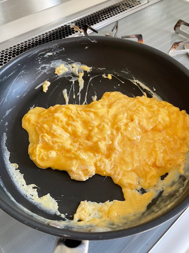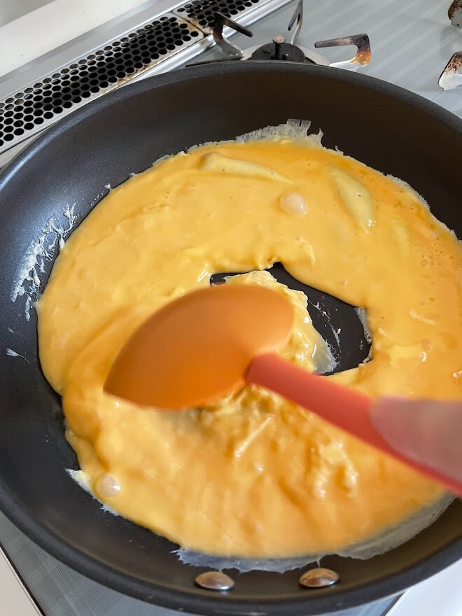 油を敷いたフライパンを強火にかけ、卵液を流し入れて大きくかき混ぜます。