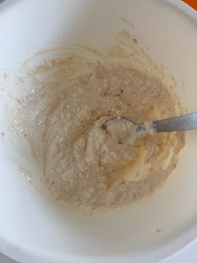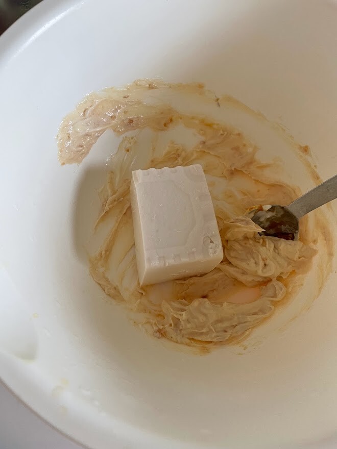 2)ボウルにクリームチーズを入れて600wの電子レンジで20秒加熱し、すぐに練ってよく混ぜる。ここに味噌とキビ砂糖を加え、さらに水切りした豆腐も加えて滑らかに混ぜる。