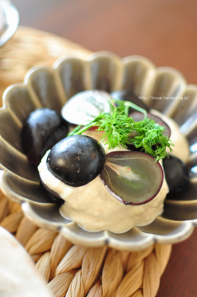 3)器にぶどうと2の豆腐を交互に重ねて入れ、最後にディルをちぎって乗せる。