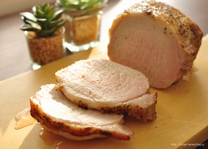 作り続けたい◎基本のローストポーク 材料(6人分くらい)・アメリカンポーク背ロース塊肉 1キロ・塩 10g・砂糖 30g・ブラックペパー 少々 作り方1)塊肉に、塩と砂糖を振って手でよくなじませ、厚手のポリ袋に入れて冷蔵庫で一晩おく。2)焼き始める1時間前に冷蔵庫から取り出し、室温に戻す。ドリップを拭き、クッキングシートをしいた天板にのせて(脂身を上にする)、ブラックペパーを振る。オーブンは160度に予熱する。3)160度のオーブンで50分焼く。焼きあがったらアルミ箔に包んで1時間ほどおく。ローストポークに合うソースのレシピ↓↓↓ 2022/12/14のレシピ < 前の記事次の記事 > コメント コメントフォーム 名前 コメント 記事の評価 リセット リセット 顔 星 情報を記憶 コメントを投稿する