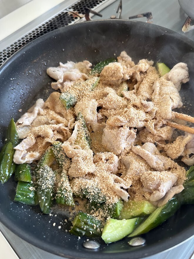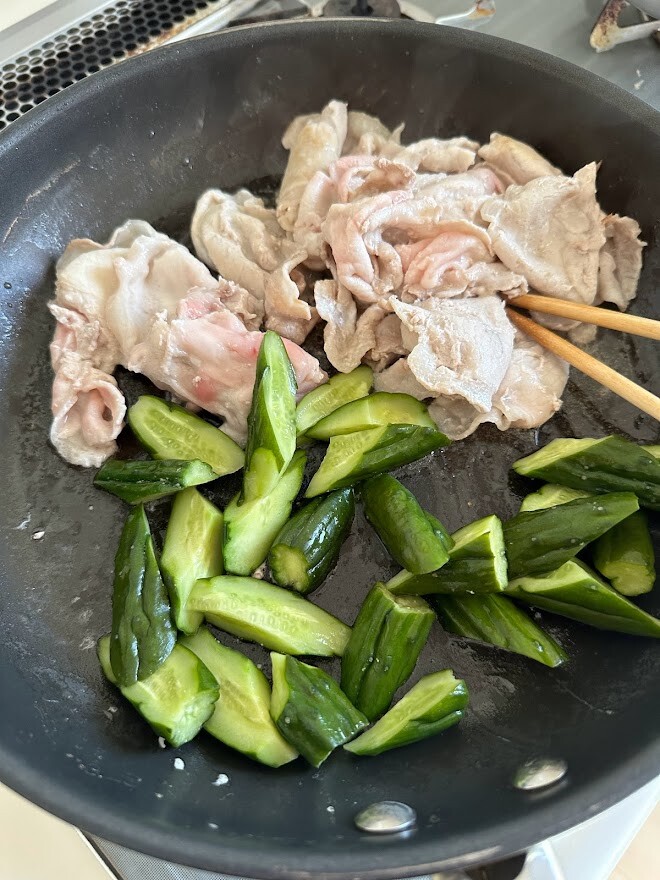 ごま油で豚肉を色が変わるまで炒めたら、きゅうりを入れます。