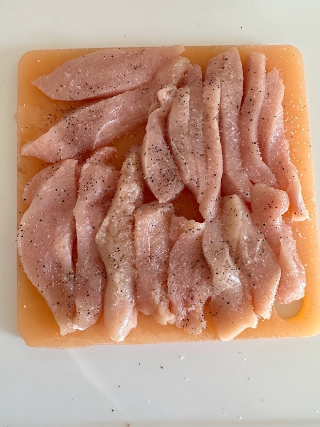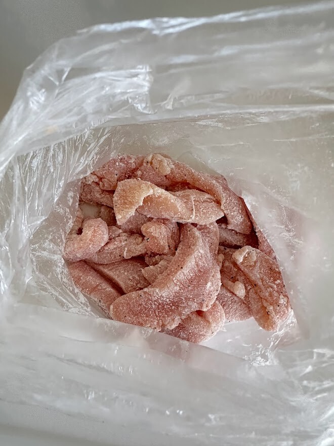 1)鶏むね肉はスティック状に切り、塩、胡椒を軽くまぶす。ポリ袋に片栗粉と一緒に入れて振り混ぜ、全体に粉をまぶす。