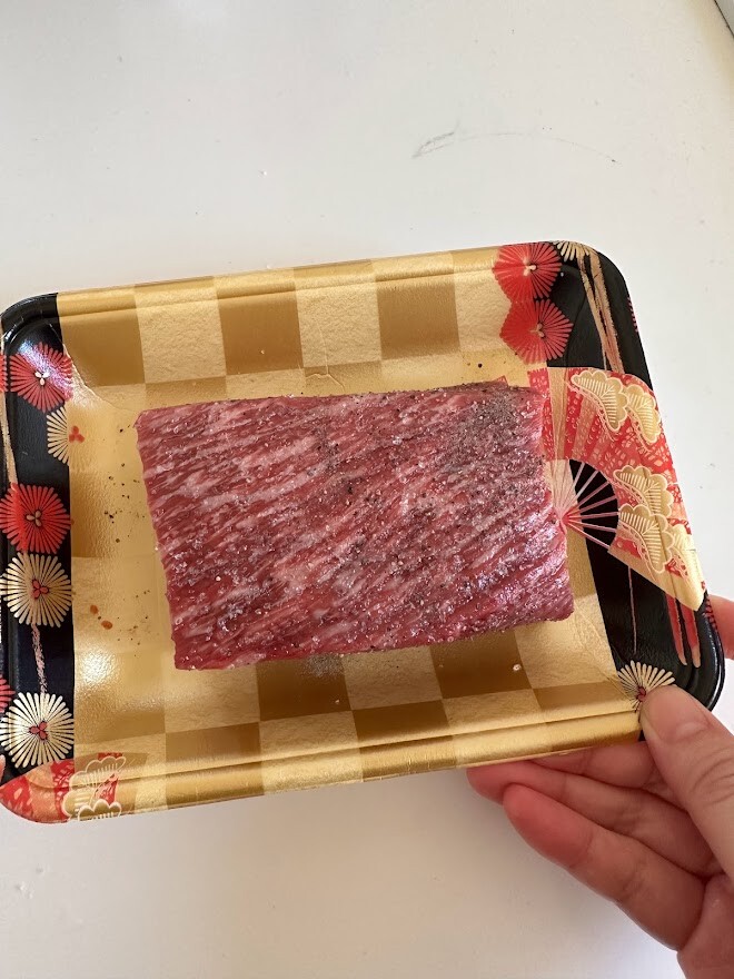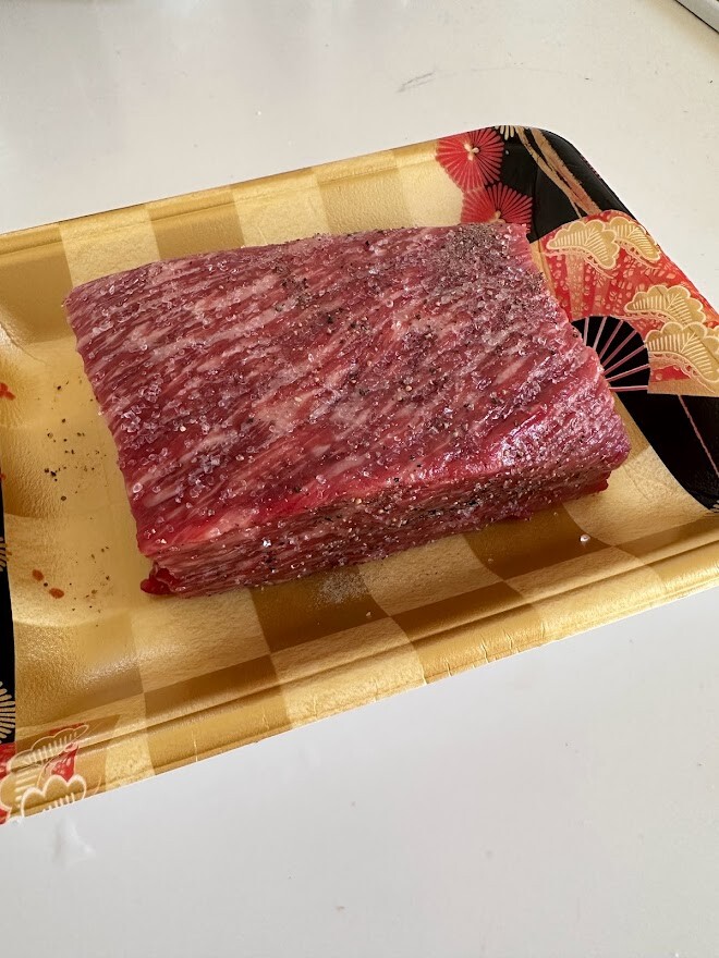 1)牛肉は焼き始める30分前に冷蔵庫から出し、室温におく。キッチンペーパーで表面を拭き、塩、ブラックペパーを表面に振り、手でなじませる。