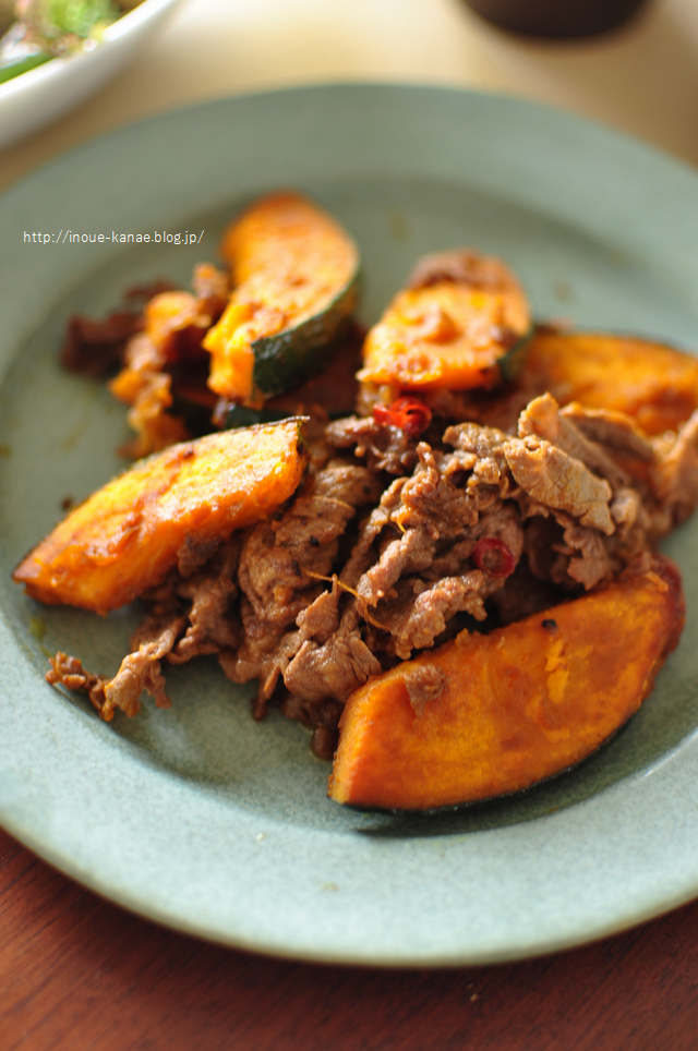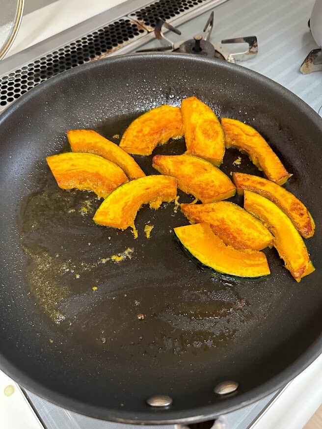最初にお肉にしっかり味を馴染ませてから、かぼちゃのほうはおまけくらいに軽めにお肉に絡める程度にすると、かぼちゃも崩れず、食べた時の味のバランスも良いです。