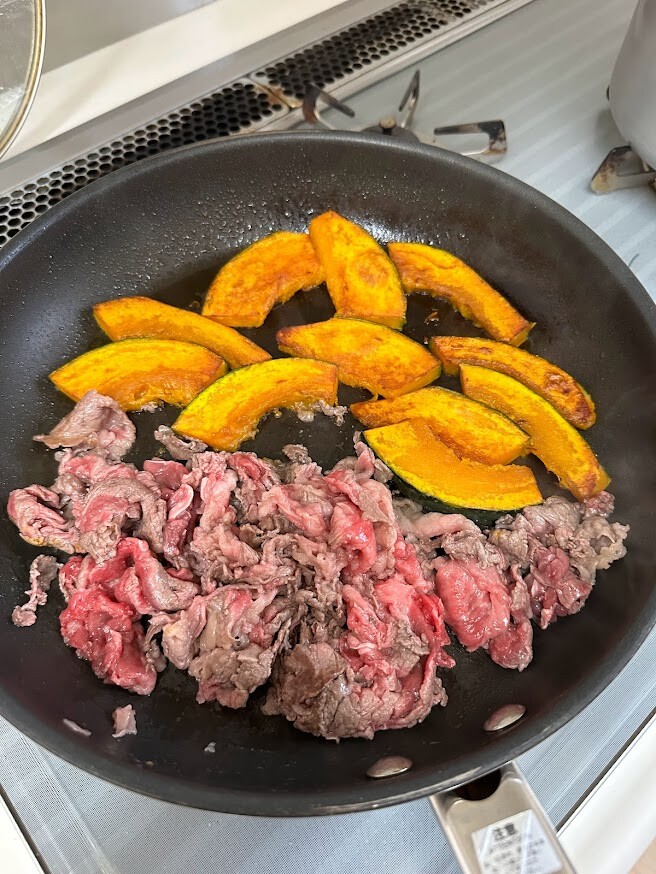 1)かぼちゃは5ミリ厚さに切る。フライパンに油をひいてかぼちゃを並べ、蓋をして中火にかける。5分ほど経ったら蓋を取って裏返して端に寄せ、空いたところに牛肉を入れてほぐす。