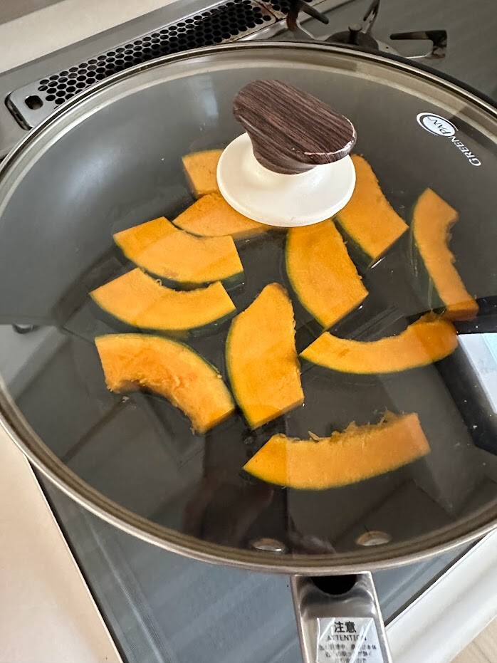 フライパンに油をひき、5ミリ厚さくらいに切ったかぼちゃを並べます。