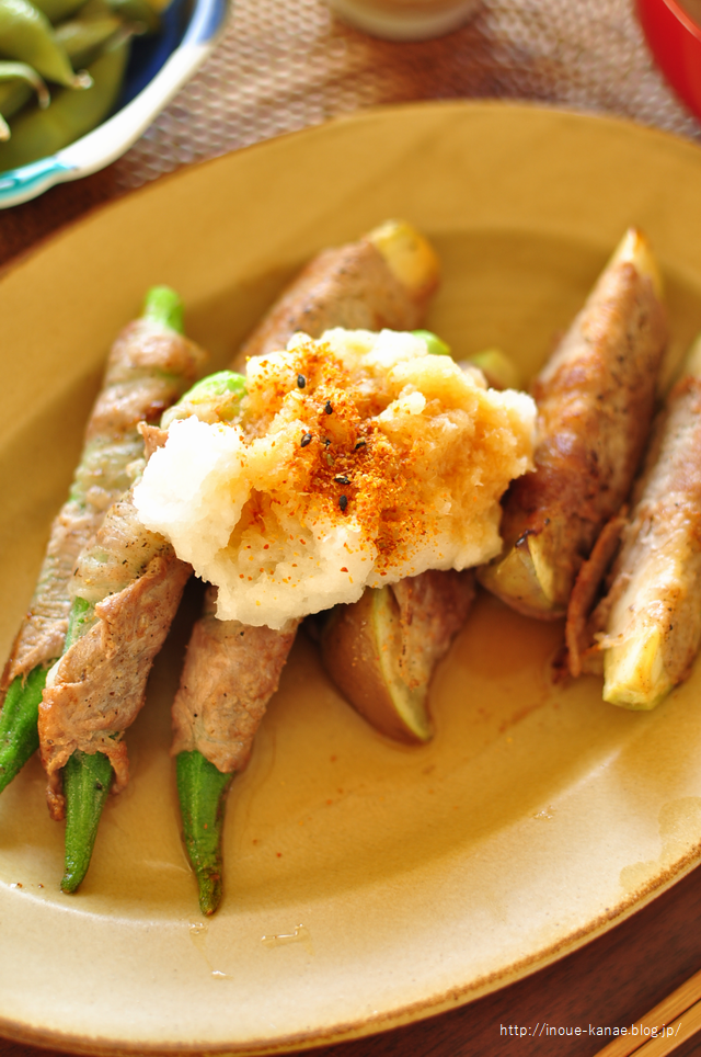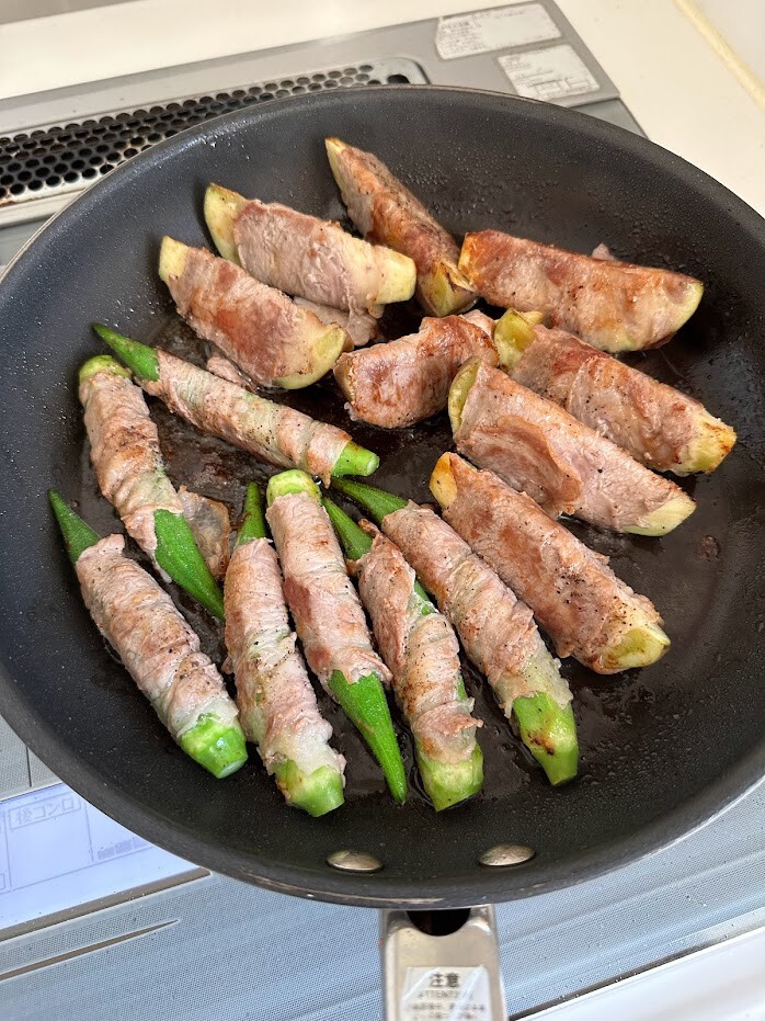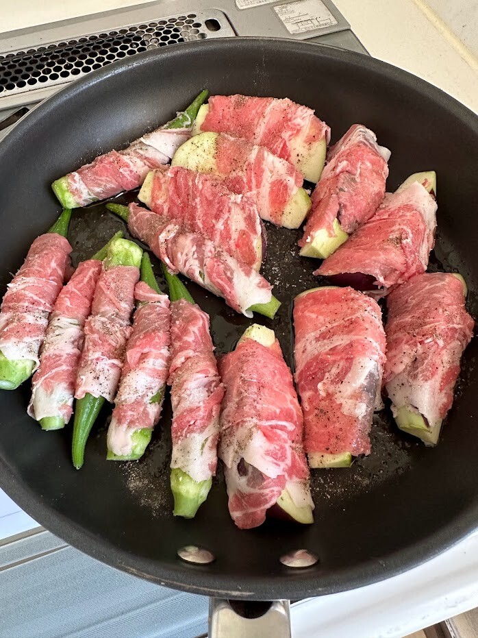 ナスもオクラも生のまま豚ロースしゃぶしゃぶ用のお肉を巻いています。