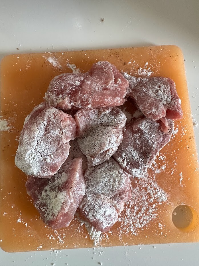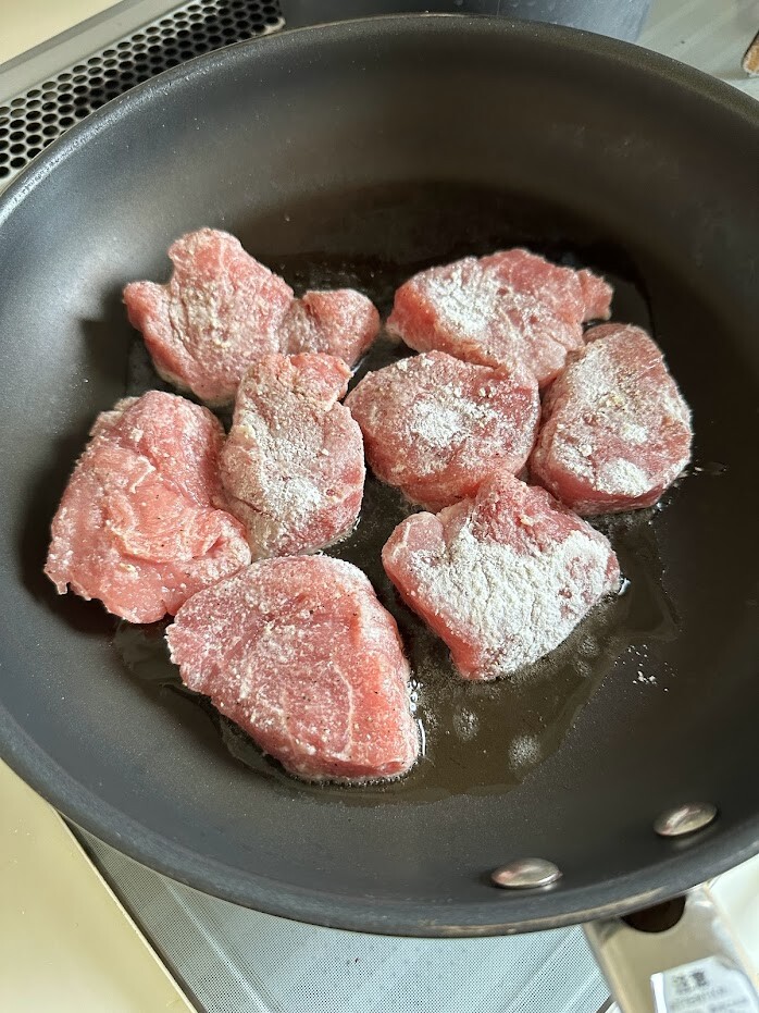 2)豚ヒレ肉は1.5センチの厚みに切り、切り口を掌で押さえて広げてから、塩、胡椒を振って薄力粉をまぶす。