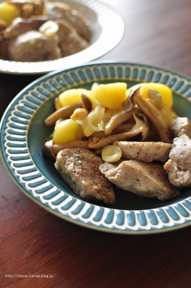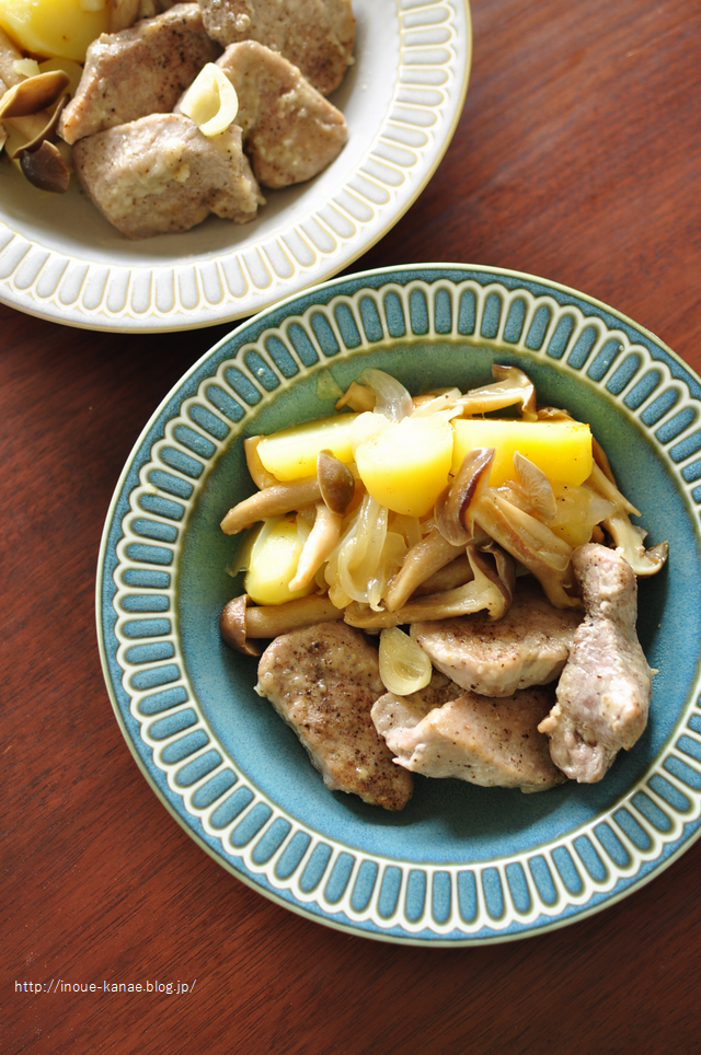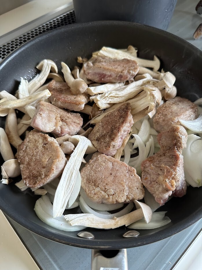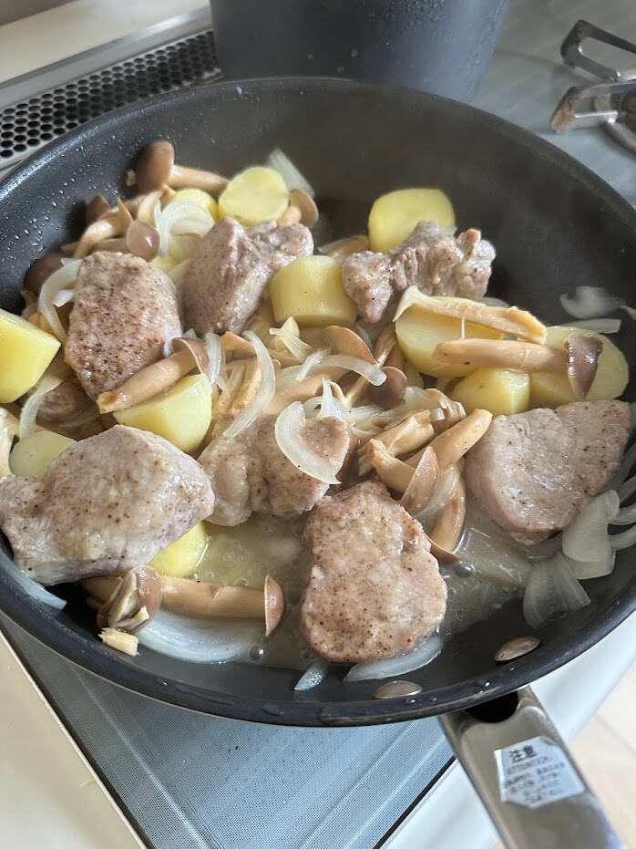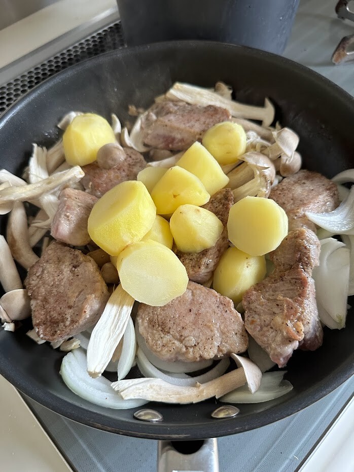 3)フライパンにオイルをひいて中火にかけ、2の豚ヒレ肉を並べてこんがりと焼く。片面焼けたら裏返して端に寄せ、玉ねぎとしめじ、ジャガイモ、ニンニクを入れて塩を振って広げ、豚ヒレ肉は野菜の上に乗せる。
