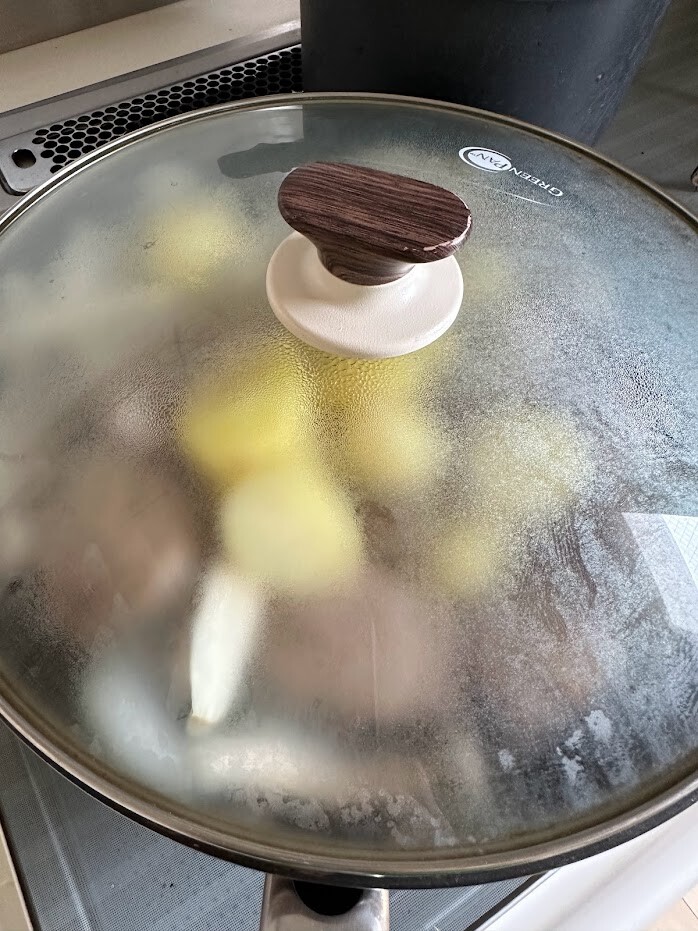 4)白ワインビネガーを振り入れ、蓋をして中火から弱火で7~8分ほど蒸し焼きにする。