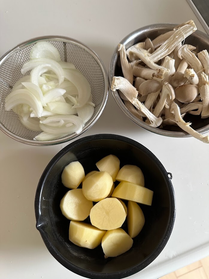 玉ねぎは薄切り、丹波しめじは石づきを取って手で割きます。