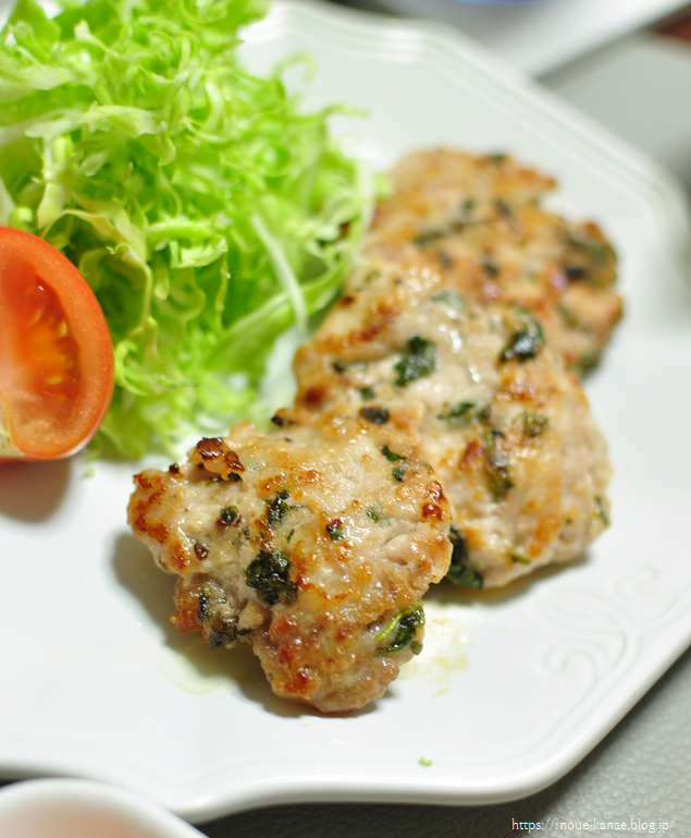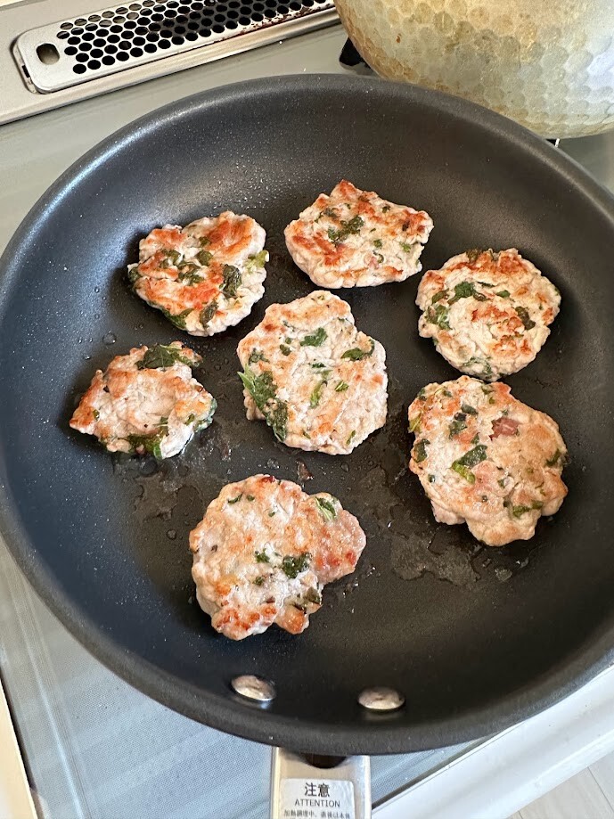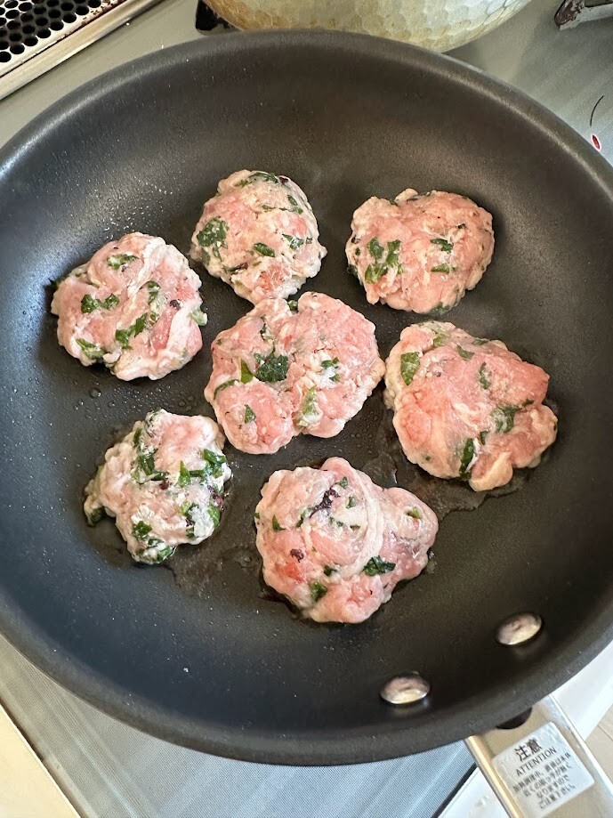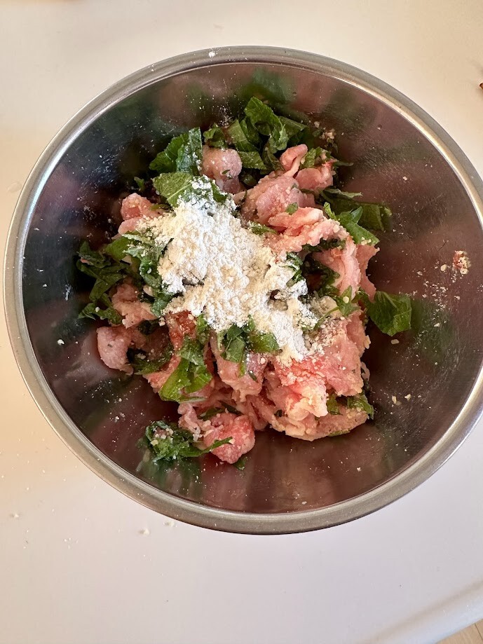 2)ボウルに1と豚コマ、粉チーズ、塩、胡椒、薄力粉を入れて手でよくなじませるように混ぜ込む。指先でつまむようにして混ぜるとよく混ざります。これを12等分くらいにしてぺったんこに丸める。