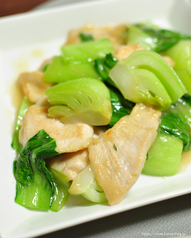 2)フライパンに油をひいて中火にかける。1の肉を並べて両面焼き、青梗菜の軸の部分を入れて炒める。油が回ったら葉の部分とBを入れてひと煮立ちさせる。