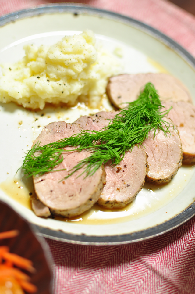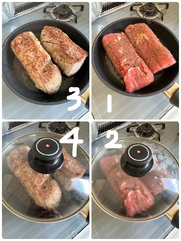 2)フライパンにオイルをひいて煙が出るくらいまで熱し、1のヒレ肉を並べる。蓋をして中火で4分動かさずに焼き、裏返して再び蓋をして4分加熱する。火を止め、蓋を取らずにそのまま30分余熱でおいておく。