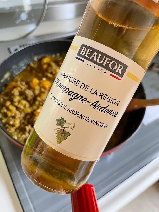 なので、トマトを入れる代わりに何らかの酸味を入れたいなと思い、そこで酸味と言えばお酢でしょ!ってことでワインビネガーを使用したというわけです。