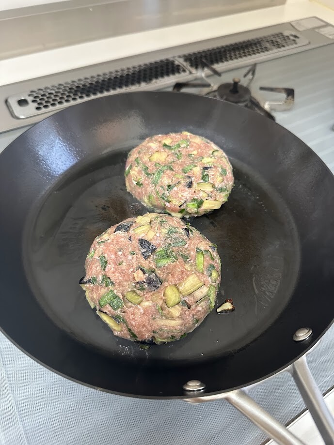 3)フライパンに油をひき、中火にかける。2の肉だねを並べて2分ほど焼き、こんがりいい色になったら裏返して裏面も1分ほど焼く。火を弱めて蓋をし、5~6分ほど蒸し焼きにする。