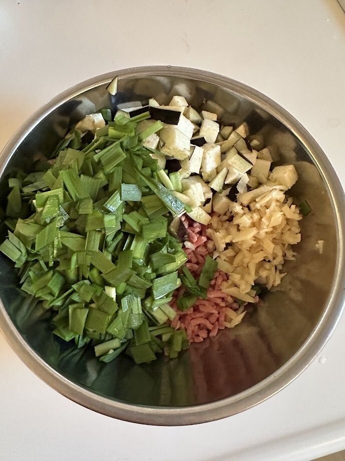 1)ナスは1センチ角に、ニラは1センチ幅に切り、生姜はみじん切りにして合いびき肉、Aと一緒にボウルに入れる。ナスはすぐに混ぜ始めるので特に水にさらしたりしていません。